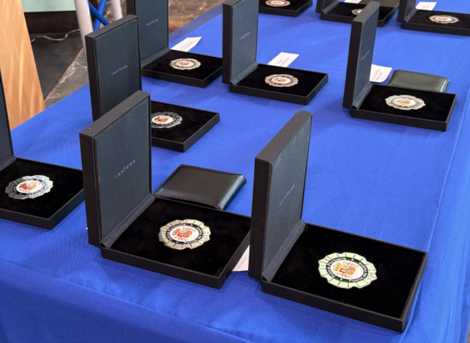 El presidente del Puerto de Huelva, Alberto Santana, junto con el director y el jefe de Área de Explotación, Alfonso Peña y Abelardo Budia, respectivamente, han hecho entrega de las placas a los nuevos miembros en un emotivo acto junto a familiares y amigos.