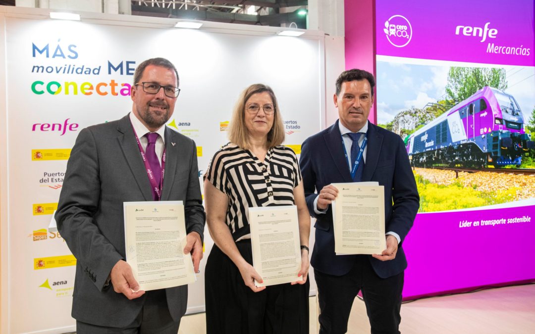Barcelona, 7 de junio de 2023 (Renfe)._ El presidente de Renfe, Raül Blanco; la presidenta de Adif, María Luisa Domínguez; y el presidente de la Autoridad Portuaria de Huelva (APH) Manuel Alberto Santana, han firmado esta mañana en el Salón Internacional de la Logística (SIL) que se está celebrando en Barcelona, un protocolo de actuación para la puesta en marcha de una Autopista Ferroviaria en ancho ibérico entre Huelva y Madrid y su prolongación futura hasta Zaragoza.