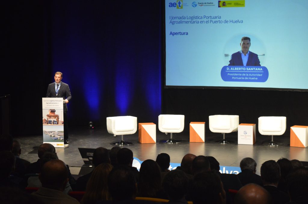 En la apertura de la jornada han intervenido el presidente del Puerto de Huelva, Alberto Santana y el presidente de la Asociación Española de Transporte (AET), Juan Manuel Martínez.