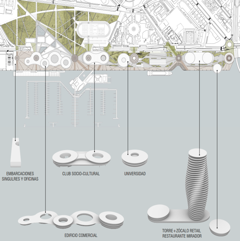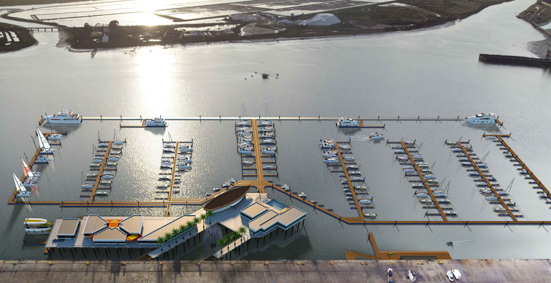 La Marina Deportiva se alzará sobre una plataforma pilotada sobre el agua de más de 7.200 metros cuadrados, y estará dotada de un club náutico, zonas comerciales, barco-restaurante, gimnasio y escuela deportiva, entre otros espacios. ste complejo náutico, comercial y de ocio dispondrá de 400 atraques.