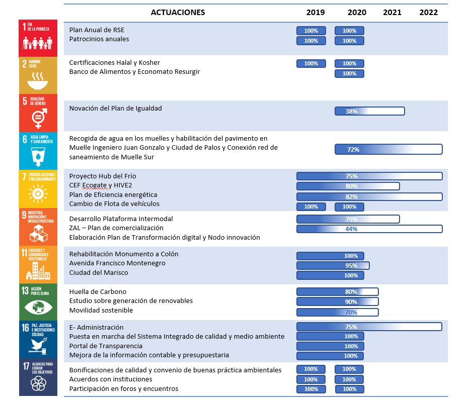 Debido a su estrecha vinculación con la actividad portuaria y desde una perspectiva económica, merece especial mención la contribución a los ODS 9 Industria, innovación e infraestructura y 11 Ciudades y comunidades sostenibles, mediante proyectos como: El desarrollo de la plataforma intermodal con una ejecución cercana al 80%, el Plan de comercialización de la Zona de Actividades Logísticas, el proyecto de diseño de un Plan de Transformación Digital y del nodo de innovación que son claros ejemplos enmarcados en nuestra línea de competitividad. Más relacionados con la relación con el entorno y la ciudadanía, se han culminado las obras de la Ciudad del Marisco y la rehabilitación del Monumento a Colón y la obra de la Avenida Francisco Montenegro, que terminará a principios del próximo año. Todas estas actuaciones contribuyen de forma indirecta sobre el ODS 8 Trabajo decente y crecimiento económico.
